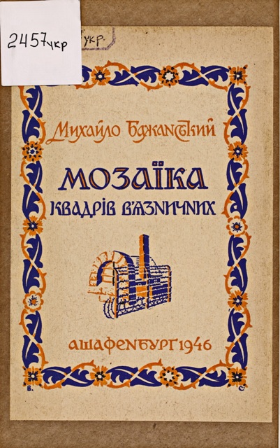 4.Бажанський М. Мозаїка – квадрів в'язничих / М. Бажанський. – Ашафенбург : Накладом Т-ва укр. політв'язнів, 1946. – 159 с. – (Б-ка політв'язня ; вип. 1). Шифр: 808 укр, 2164 укр, 2457 укр