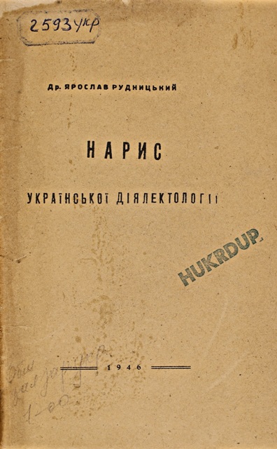60.Рудницький Я. Нарис української діялектології / Я. Рудницький. – Авґсбурґ: Накладом Укр. студентської громади, 1946. – 48 с.: іл. – (З циклу: Університетські виклади / Укр. ун-т у Львові у рр. 1921–1925). – Бібліогр.: С. 45–47. – Шифр: 2593 укр, 4144 укр, 5268 укр