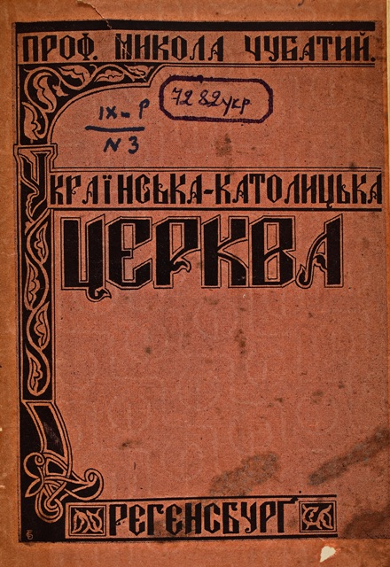84.Чубатий М. Українська Католицька церква: (Відб. з Загальної Української Енциклопедії – з найконечнішими доповненнями) / ред. Н. Вояковського. – Регенсбург : Вид-во Спілки «Укр. Слово», 1946. – 24 с. – Шифр: 7282 укр.