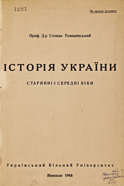 63.Томашівський С. Історія України : старинні і середні віки / С. Томашівський. - Мюнхен : УВУ, 1948. – 134 с. – Шифр: 7657 укр