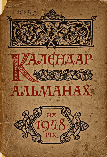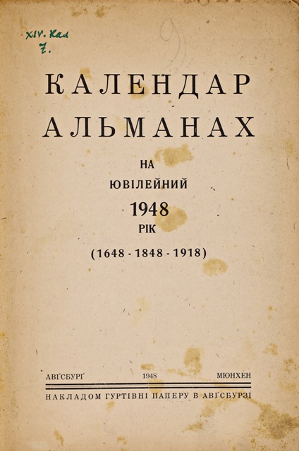 33.Календар-альманах на ювілейний 1948 рік (1648–1848–1918) / Є. Маланюк [та ін.]. – Авґсбург; Мюнхен: Накладом Гуртівні паперу в Авґсбурзі, 1948. – 208 с. : іл. – Авт. ст., проз. та поет. тв.: Є. Маланюк, Ю. Липа, Н. Полонська, Ю. Косач, С. Баран, М. Орест, П. Зайцев, Г. Ващенко, О. Олесь, О. Теліга, О. Ольжич, В. Домонтович, С. Гординський, Б. Крупницький та ін. – Шифр: 5657 укр