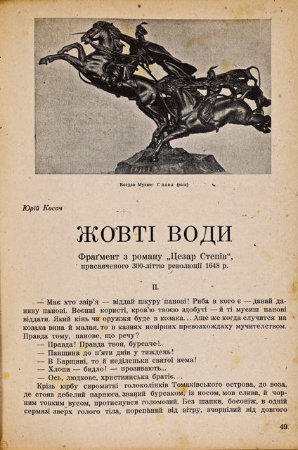 Юрій Косач «День гніву», ч.1 (1947) – історична повість про події визвольної війни 1648 року, що актуалізувала ідею боротьби за державність у контексті сучасності.