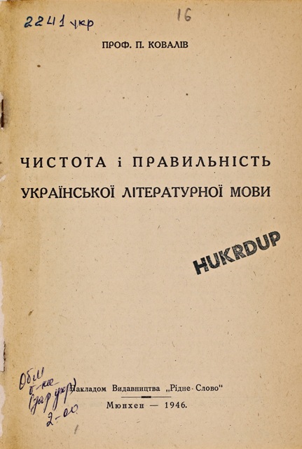 38.Ковалів П. Чистота і правильність української літературної мови / П. Ковалів. – Мюнхен: Накладом Вид-ва «Рідне слово», 1946 (Друк.: Д. Сажнін, Авґсбург) . – 34 с. – Шифр: 2798 укр., 1247 укр, 2241 укр, 6056 укр