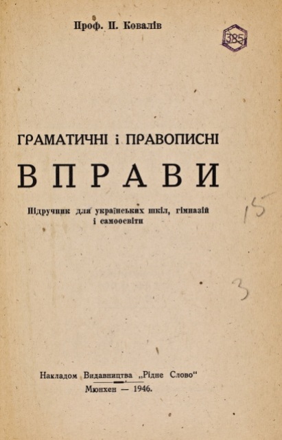 37.Ковалів П. Граматичні і правописні вправи: підручник для українських шкіл, гімназій і самоосвіти / П. Ковалів; передм. авт. – Мюнхен : Накладом Вид-ва «Рідне слово», 1946 (Авґсбурґ : Друк. Д. Сажнина) . – 64, IV с. – Шифр: 1248 укр.