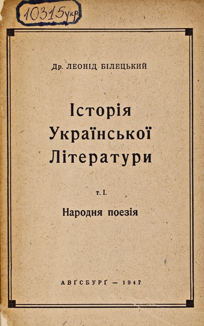 7.Білецький Л. Історія української літератури. Т. 1. Народня поезія / Л. Білецький. – Авґсбурґ : Накладом Укр. церк. вид-ва, 1947. – 328 с. – У кн. розд.: Український народ, його побут, вдача,звичаї й віра; Вірування українського народу; Обряди українського народу; Весняний цикл народних пісень; Літній зворот сонця; Обряди осіннього зрівняння дня і ночі; Обряди, що не зв'язані з народним календарем; Весілля; Похорнний обряд; Загальне значення народних обрядів; Стиль і ритміка пісень. – Шифр: 1438 укр,10315 укр