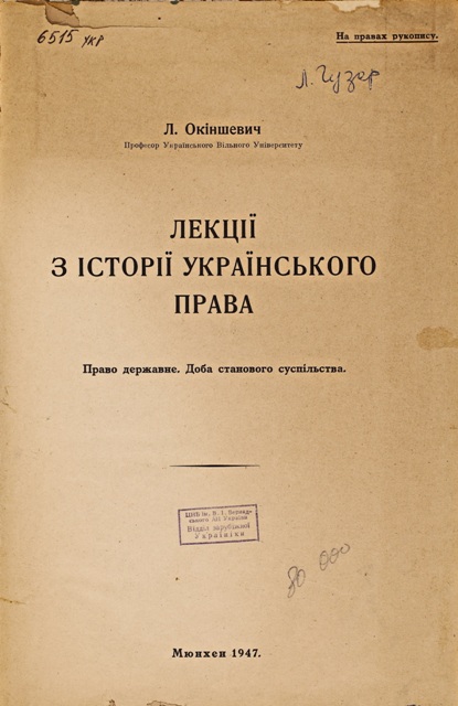 49.Окіншевич, Л. Лекції з історії українського права : право державне. Доба станового суспільства / Л. Окіншевич. – Мюнхен : [Український Вільний ун-т], 1947. – 171 с. – Шифр: 6515 укр