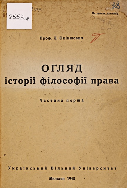 50.Окіншевич, Л. Огляд історії філософії права. Ч.1 / Л. Окіншевич. – Мюнхен: УВУ, 1948. –130 с. – Шифр: 2552 укр, 1989 укр