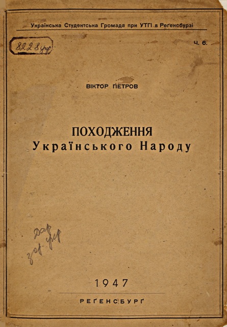 54.Петров В. Походження українського народу / В. Петров ; Українська студентська громада при УТГІ в Реґенсбурзі. – Реґенсбург : УТГІ, 1947. – 56, ХІХ, [1] с. – (Укр. студ. громада при УТГІ в Регенсбурзі ; ч. 6). – Шифр: 8228 укр
