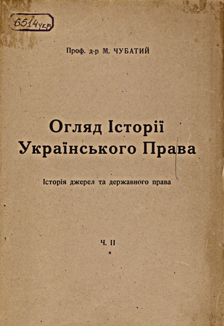 83.Чубатий М. Огляд історії українського права: історія джерел та державного права. Ч. 2 / М. Чубатий. – 3-є вид. – Мюнхен: [б. в.], 1947. – 175, [2] с. – Шифр: 6514 укр.
