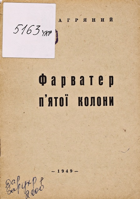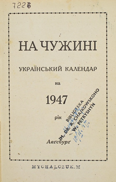 надпис: Високоповажному проф. д-ру О. Кульчицькому від автора. Мюнхен. 2. VII. 948 (1989 укр.).
