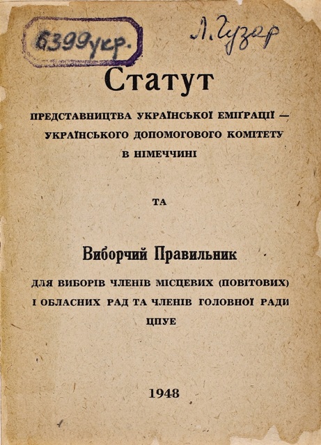 74.Статут Представництва української еміграції Українського Допомогового комітету в Німеччині для виборів членів місцевих (повітових) і обласних Рад членів Головної Ради ЦПУЕ. – Авсбург: [б. в.], 1948. – 39 с. – Шифр: 6399 укр.