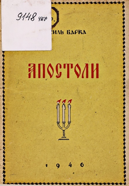 5.Барка В. Апостоли / В. Барка. – Авґсбург : Вид. І. Манила, 1946 (Друк. Д. Сажнина) . – 48 с. – (МУР / Об-ня укр. письменників). Шифр: 9148 укр, 10479 укр, 11406 укр