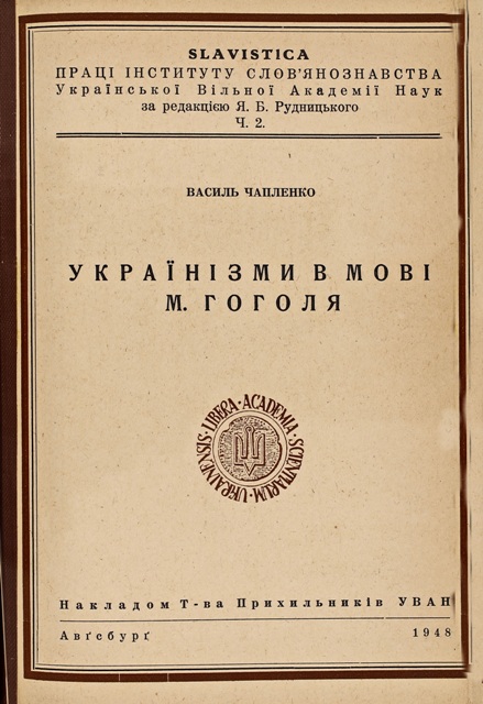 81.Чапленко В. Українізми в мові М. Гоголя / В. Чапленко; ред. Я. Б. Рудницький . – Авґсбург: Накладом Т-ва прихильників УВАН, 1948 (Друк. А. Білоус) . – 28 с. – (Slavistica / Праці ін-ту слов'янознаства УВАН ; ч. 2). – Шифр: 8561/2 укр