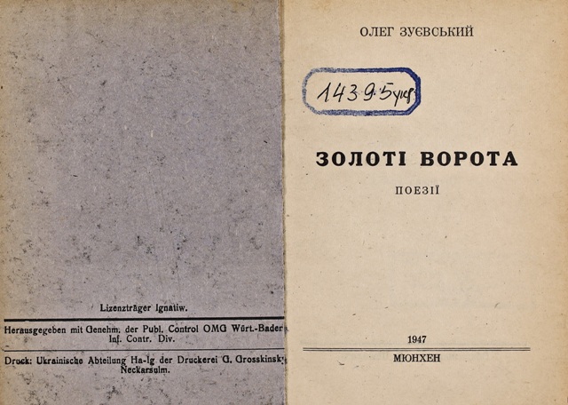 32.Зуєвський О. Золоті ворота : поезії / О. Зуєвський. – Мюнхен: [б. в.], 1947 – 62 с. – Шифр: 14395 укр