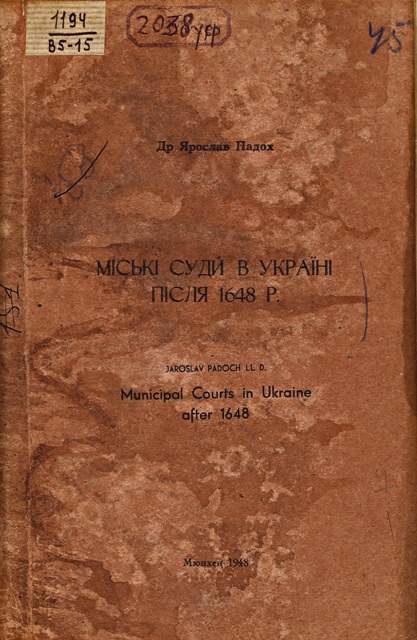 53.Падох Я. Міські суди в Україні після 1648 р / Я. Падох. – Мюнхен : [б. в.], 1948 (Друк. кооп. вид-ва "Заграва") . – 47, [8] с. – Шифр: 2038 укр