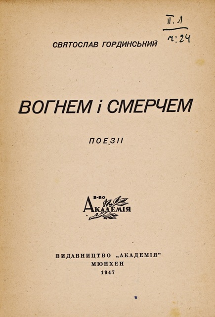 16.Гординський С. Вогнем і смерчем: поезії / С. Гординський. – Мюнхен : Академія, 1947. – 31 с. – (Сьогочасні письменники. Літературна б-ка «Рідного слова» / під ред. Т. Курпіти). Шифр: 7510 укр