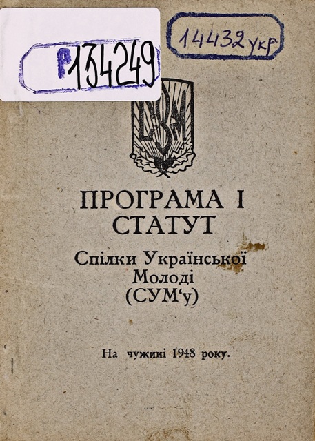 58.Програма і Статут Спілки Української молоді (СУМу). – [Б. м.] : На чужині, 1948. – 36 с. – Шифр: 14432 укр