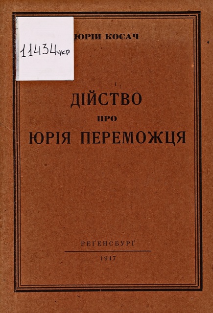 41.Косач Ю. Дійство про Юрія-переможця : трагедія / Ю. Косач ; вст. сл. авт. – Регенсбург : Накладом Видавн. спілки «Укр. Слово», 1947. – 64 с. – Шифр: 7196 укр.11434 укр.