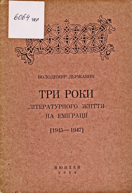 24.Державин В. Три роки літературного життя на еміграції (1945–1947) / В. Державин. – Мюнхен : Академія, 1948. – 30 с. – У кн. огляд творів Л. Полтави, О. Ольжича, Ю. Клена, У. Самчука, С. Гординського та ін. (за вказані роки). – Шифр: 6064 укр