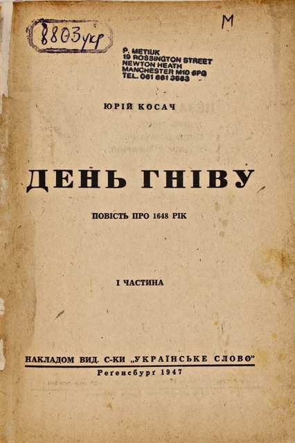 40.Косач Ю. День гніву : повість про 1648 рік. Ч. 1 / Ю. Косач; вст. сл. авт. - Регенсбург : Накладом Видавн. спілки «Укр. Слово», 1947. – 135 с. – Шифр: 3891 укр, 6158 укр, 8803 укр