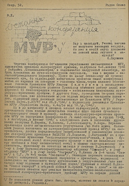 Серед видань, які зберігаються у відділі зарубіжної україніки Інституту книгознавства НБУВ: «МУР: Література. Мистецтво. Критика», альманах, ч.1 (1946) – перша програмна збірка об’єднання, що стала майданчиком для творчих дискусій і представила літературні пошуки провідних митців еміграції.
