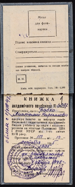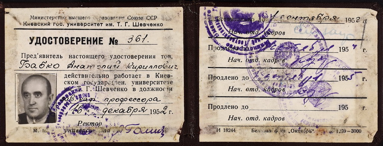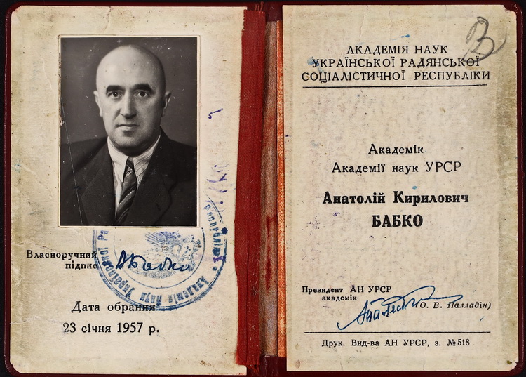 З біографічних документів А. Бабка експонуємо посвідчення завідувача кафедри та професора Київського державного університету ім. Т. Г. Шевченка, академіка АН УРСР, посвідчення з допуском до закритих лабораторій та виробництв, книжку академічного пенсіонера.