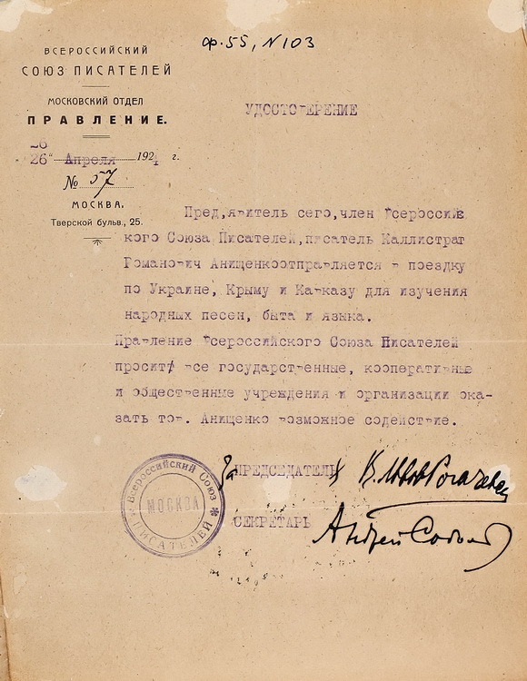Ховаючись від переслідувань поліції, Калістрат Романович опинився на Кавказі, працював у тбіліській пресі. У фондах Одеської національної наукової бібліотеки зберігаються листи К.Р. Анищенка до М.Ф. Комарова, які дають уявлення про життя письменника у 1912–1913 рр. Цей період характеризується активним підйомом творчості Калістрата Романовича [Мороз-Стрілець. Літературна Україна, 1970, 6 жовтня].