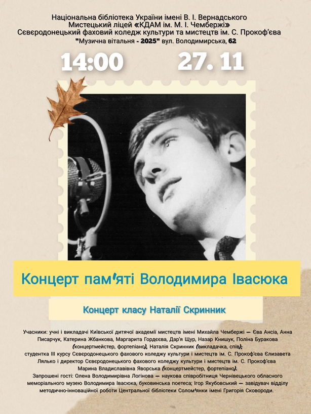 27 листопада 2025 року в музичній вітальні відділу музичних фондів Національної бібліотеки України імені В. І. Вернадського відбувся концерт, присвячений пам'яті видатного українського композитора Володимира Михайловича Івасюка. Державними нагородами – Герой України, лауреат Національної премії України імені Тараса Шевченка в номінації «За внесок у розвиток музичної культури України XX століття» – композитора відзначили, на жаль, уже посмертно. Його життя трагічно обірвалося в 30 років. Залишився величезний творчий спадок композитора – понад сотня естрадних та пів сотні інструментальних творів.