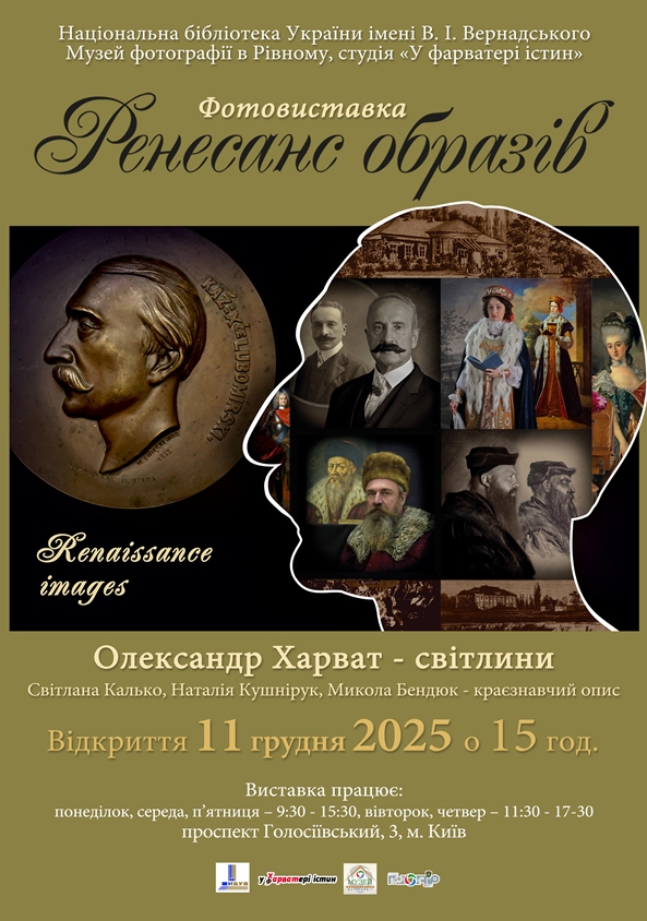 Національна бібліотека України імені В. І. Вернадського запрошує на відкриття фотовиставки «Ренесанс образів» відомого українського фотохудожника Олександра Харвата, яке відбудеться 11 грудня 2025 року о 15:00.