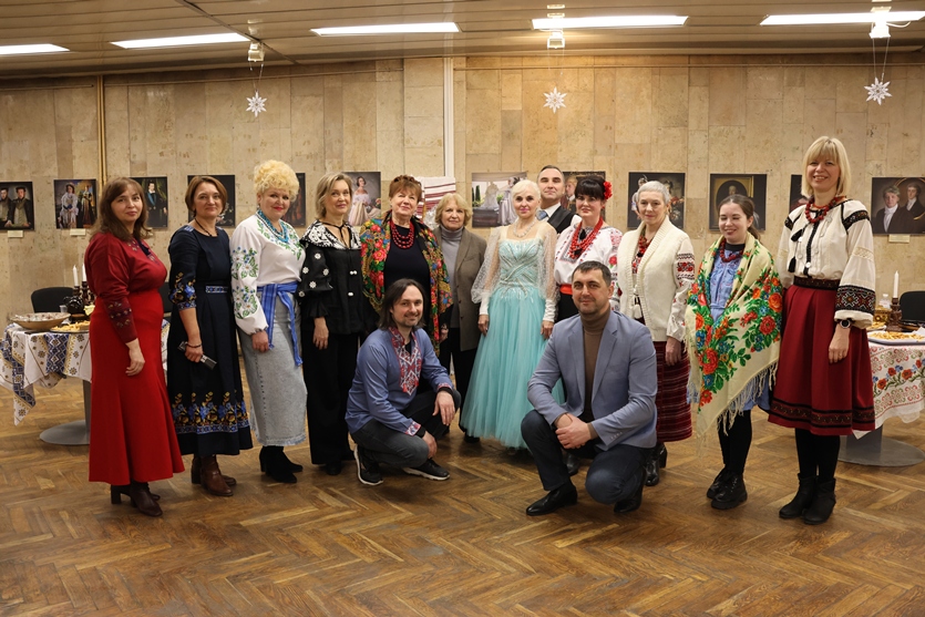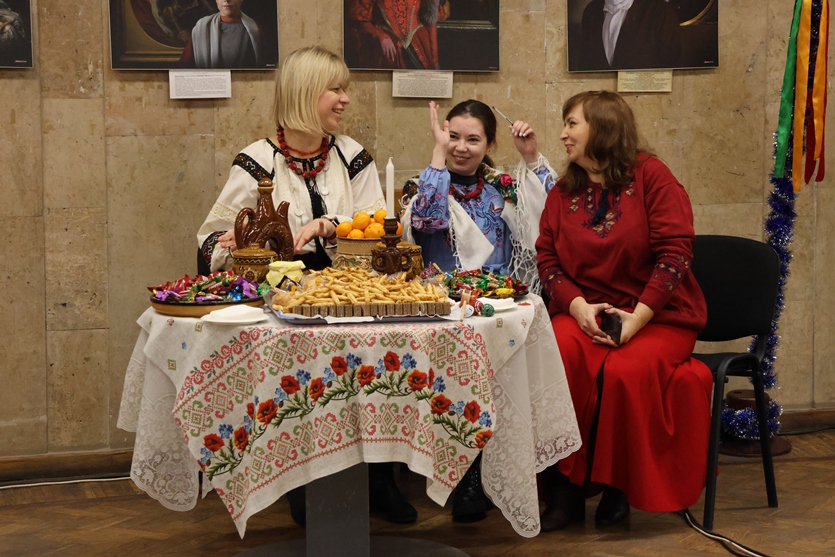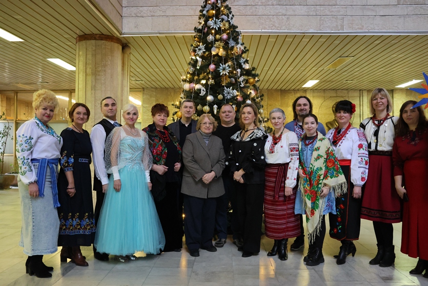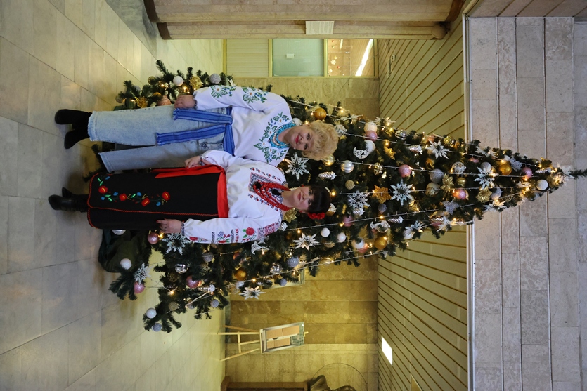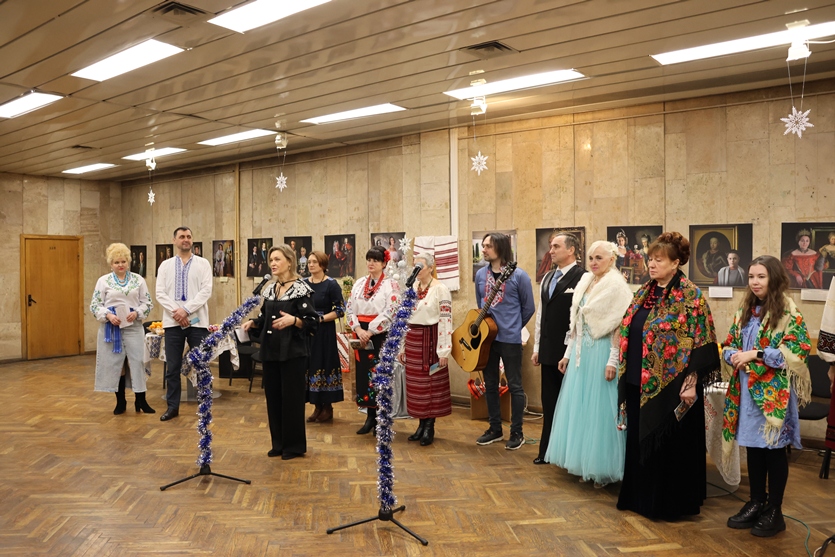 Але не лише веселий настрій панував у холі конференц-зали, святково прикрашеному руками наших колег-ентузіастів. Подячно вклонилися присутні всім захисникам і захисницям України, вшанували пам’ять полеглих воїнів, серед яких, на жаль, є й працівник НБУВ Артем Торопов… Тож, крім всесвітньо відомого «Щедрика» й колядок, прозвучали й пісні про Бахмут, про вірність своїй землі та звитяжність її захисників.