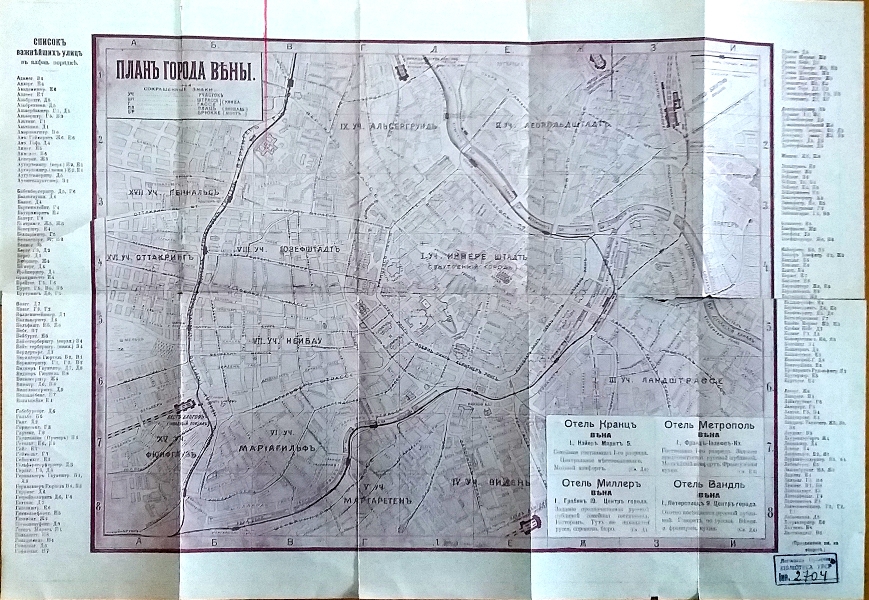 За своєю інформативністю, детального розгляду заслуговує також план Відня 1886 р. (поз № 4 Переліку), на якому показано все найбільш цінне.і цікаве для користувача, що на той час було в місті. Нажаль, за межами плану залишилася така архітектурна перлина, як літня резиденція Габсбургів – Шенбрун. План має координатну сітку, яка допомагає віднайти той чи інший об»ект. Округи виділено кольором і підписано. Місто поділено на квартали, з нумерацією будинків, На плані показані також трамвайні маршрути, р. Дунай і Дунайський канал.