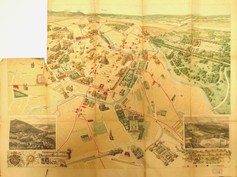 «Монументальний план Відня» [1887] року, а точніше перспектива (поз. № 5 в Переліку), охоплює територію від Арсеналу до Каленбергу, від Обсерваторії до Кайзермюлле. План дозволяє не тільки побачити місце розташування найвідоміших архітектурних і історичних пам’яток міста (на плані є вулична мережа, основні вулиці підписані), але й уявити як вони виглядали, адже ці об’єкти показані малюнками, що дуже точно повторюють контури реальних об´єктів і дозволяють їх ідентифікувати, адже підписи під ними відсутні. Крім того, на плані показані трамвайні лінії, залізничні колії, та залізничні вокзали, мости.