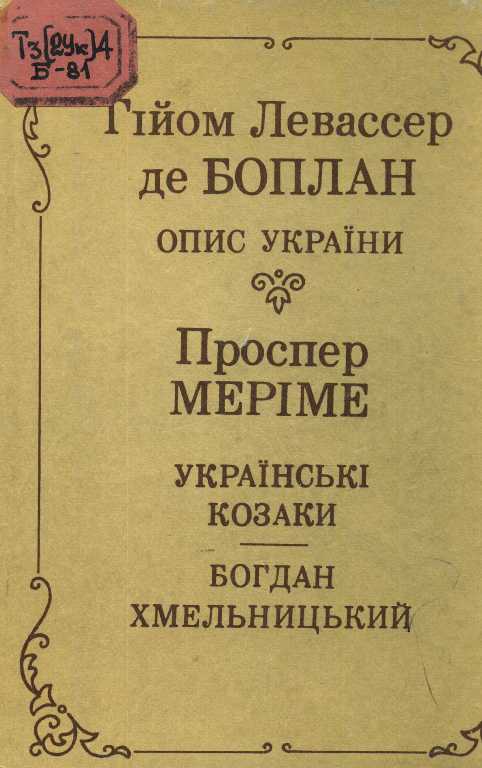 Опис України [Текст] / Г. Л. Боплан. Українські козаки та їхні останні гетьмани; Богдан хмельницький/ П. Меріме; пер. з фр. Я.І. Кравця. - Львів. : Каменяр, 1990. - 301 с.