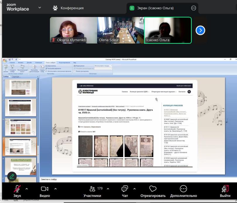Виступи супроводжувалися презентаціями, насиченими яскравим ілюстративним матеріалом. З усіма виступами на тематичному науково-методичному семінарі у рамках підвищення кваліфікації бібліотекарів «Україніка у цифровому форматі» можна ознайомитися на офіційному YouTube-каналі Національної бібліотеки України імені В. І. Вернадського (https://www.youtube.com/@nbuv).