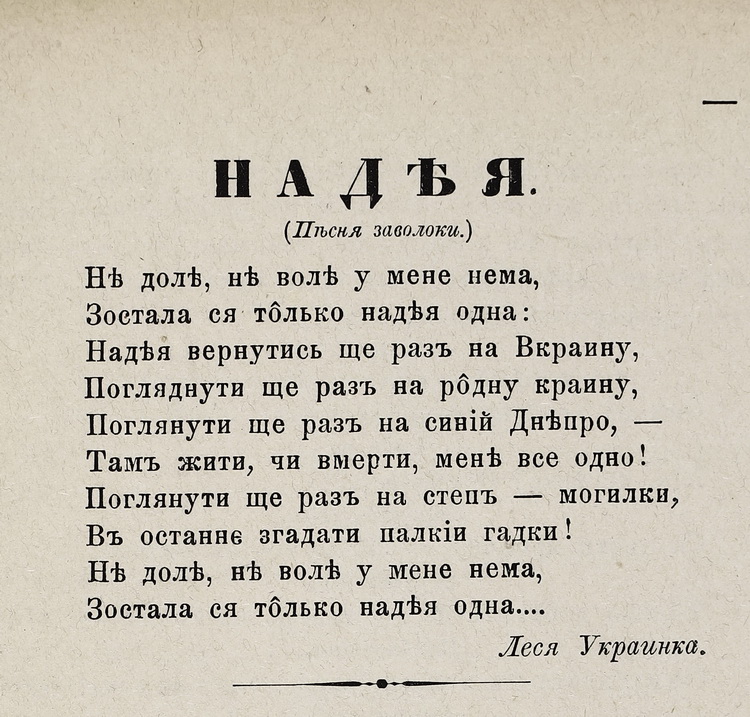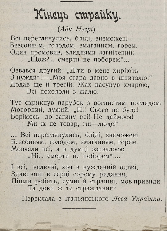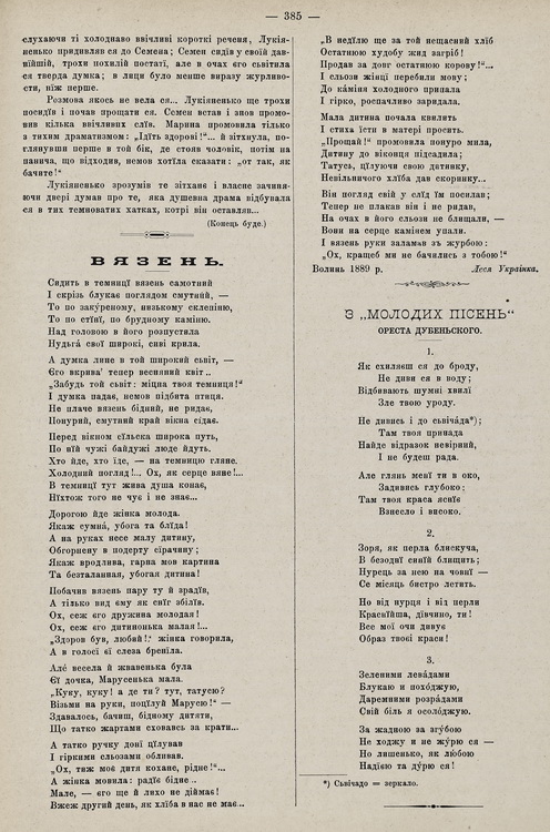 1889 р. став роком активної перекладацької діяльності поетеси. У журналі було надруковано її переклади творів німецького поета Генріха Гейне: «Вони мене дражнили…», «Чого так поблідли ті рожі ясні?», «Як я про свою говорив вам печаль» (№ 1, с. 5). У № 2 (с. 24–25) було опубліковано перший прозовий твір Лесі Українки — «Така її доля» (перше реалістичне оповідання про трагічну долю жінки).