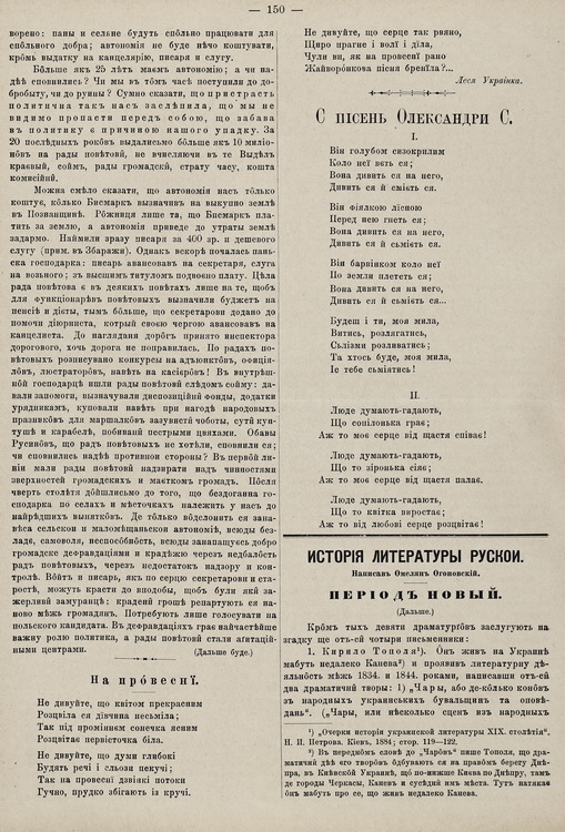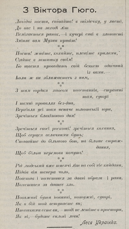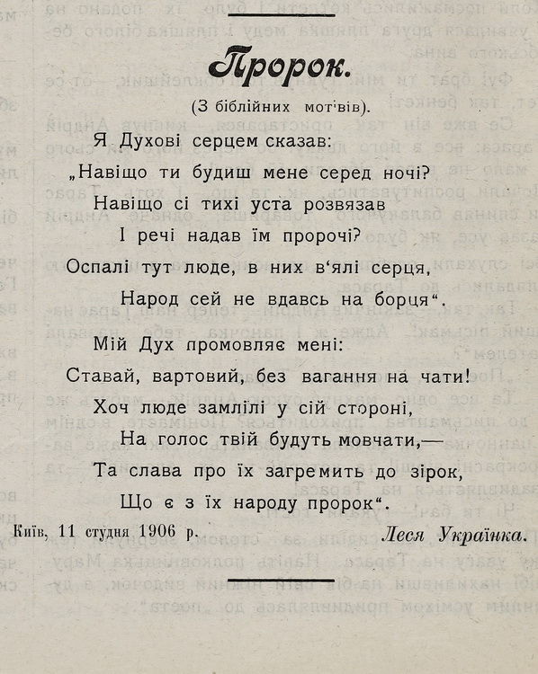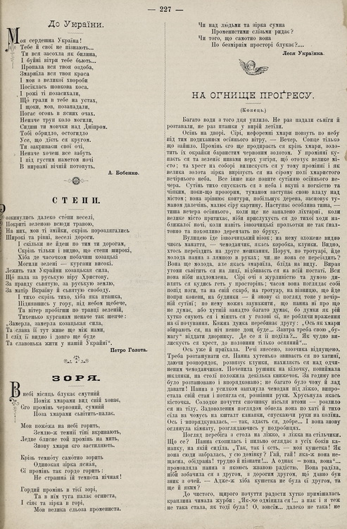 Крім того, цього ж року з’явилася низка її поезій: «Завітання» (№ 2, с. 25), «До природи» (№ 8, с. 133 — зразок пейзажної лірики), «Напровесні» (№ 9, с. 150 — вірш-маніфест ранньої інтимно-пейзажної лірики, що увійшов до збірки «На крилах пісень»), «Співець» (№ 21, с. 350–351), «В’язень» (№ 23, с. 335 — зразок громадянської лірики) та «Святий вечір!» (№ 24, с. 286–287).