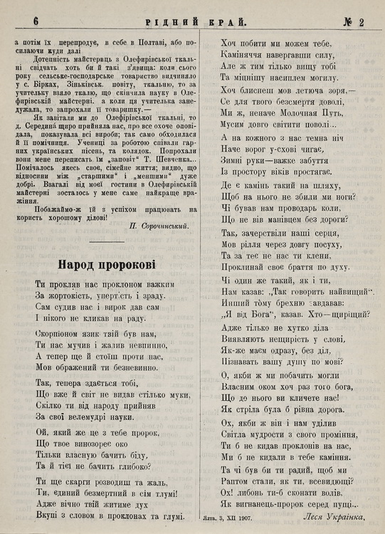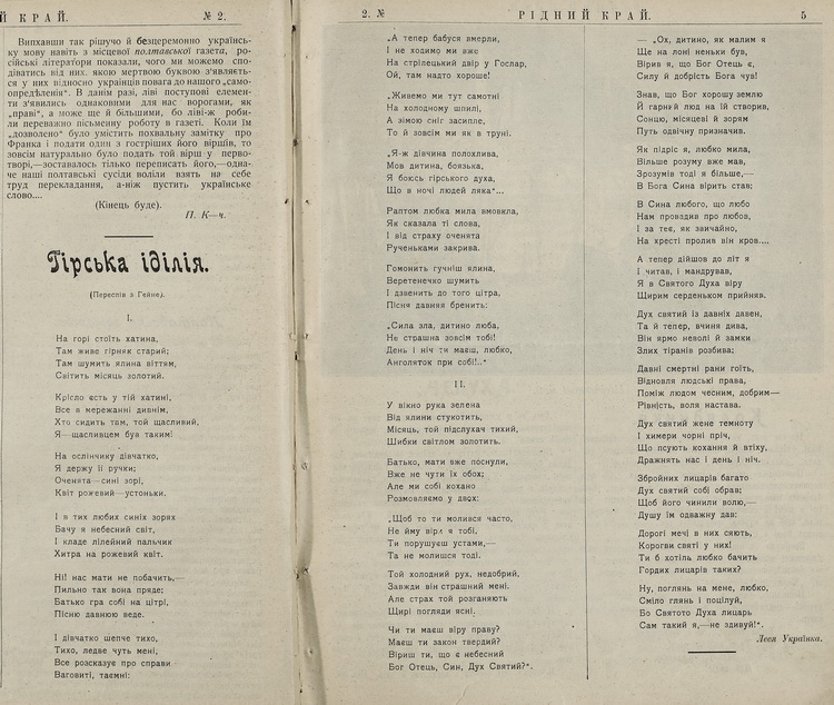 У щотижневому громадському і літературно-науковому журналі «Рідний край», що виходив у Полтаві у 1905–1907 рр., було надруковано переклади Лесі Українки з Віктора Гюго, Джорджа Байрона та Ади Негрі, а також її власні твори: «Пророк», драматичну поему «В катакомбах», цикл поезій «Весна в Єгипті», написаний під час лікування письменниці в цій країні.
