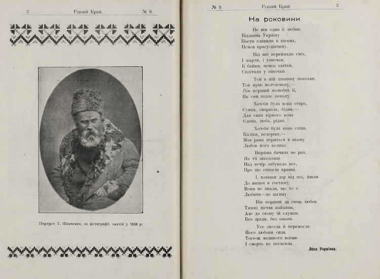 У 1911 р. Леся Українка написала твір «На роковини» (№ 9–10, с. 3), присвячений пам’яті Тараса Шевченка. Також у журналі «Рідний край» було опубліковано такі відомі твори, як «Королівна» (1912, № 5, с. 5–8) та «Бояриня» (1914, № 1–6).