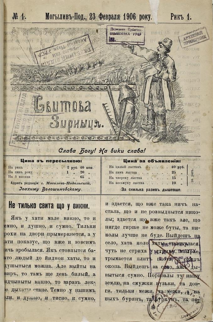 - Світова зірниця. Редактор-издатель Іоахимь Волошиновскій. У 1906 р. виходила старим правописом. – Могилів-Подільський, 1906–1913.