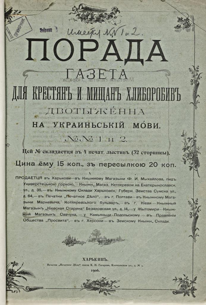 - Порада. Видавець і одвітний розпорядник-ред. Михайло Хведотовичъ Лободовскый. – Харків, 1906.