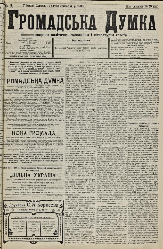 - Грінченко Б. Новий закон про пресу // Громадська думка. – Київ, 1906. – № 9 (11 січ.). – С. 1.