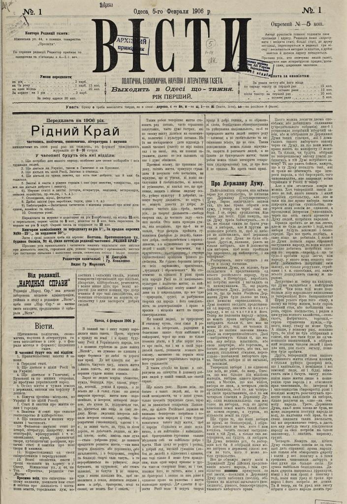- Народня справа. Видає і за ред. відповідає І. Луценко. – Одеса, 1906.