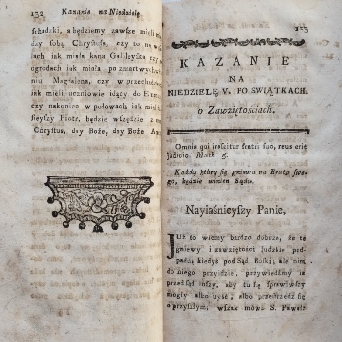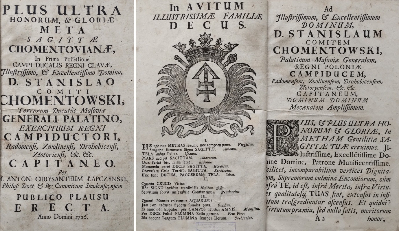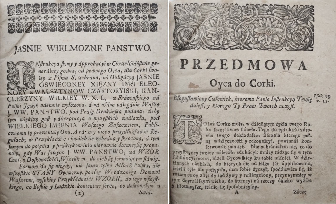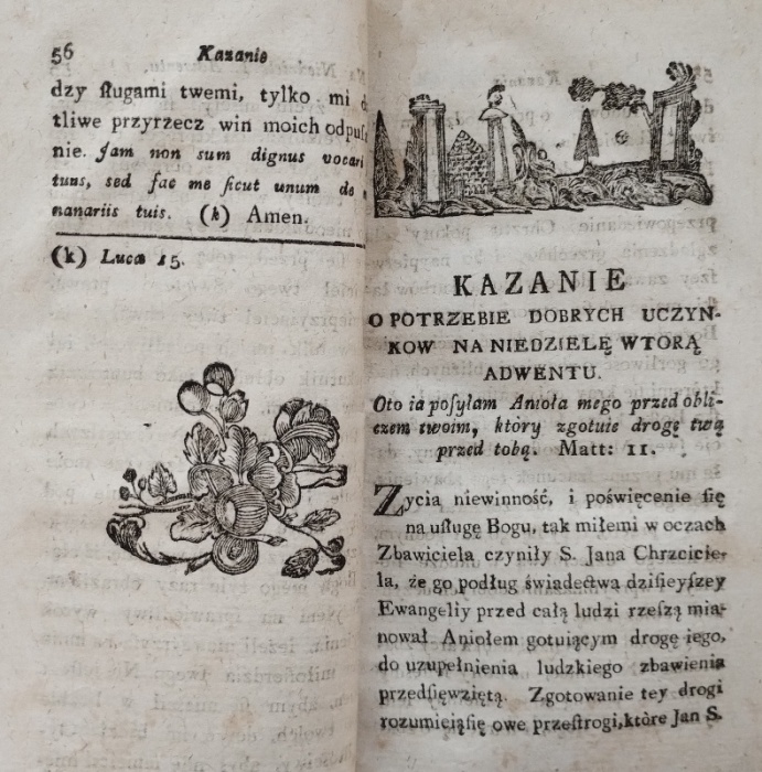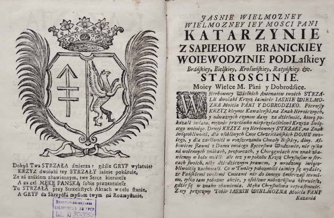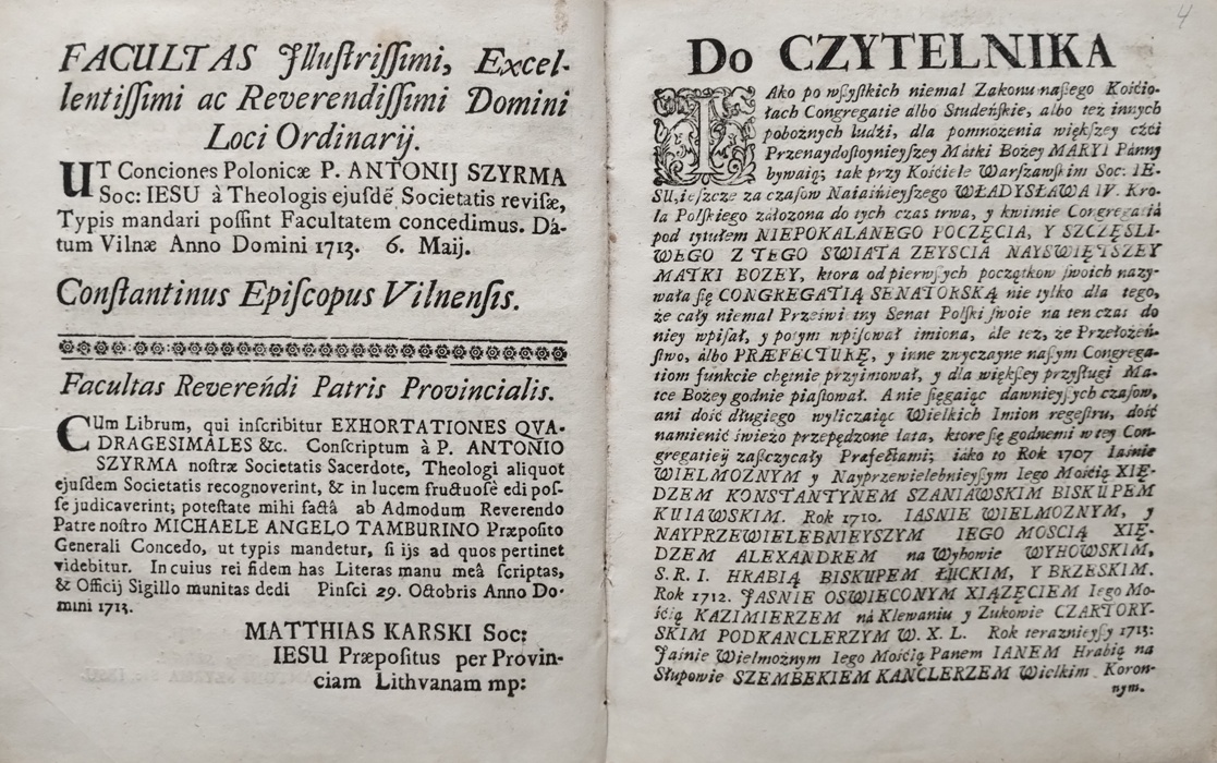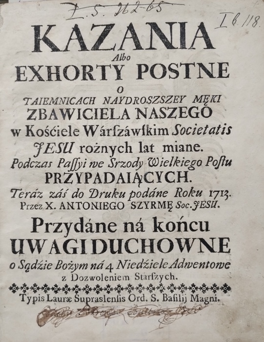 Найраніший друк, представлений на виставці, – це проповіді єзуїта Антонія Ширми «Kazania albo Exhorty postne o tajemnicach naydroszszey męki Zbawiciela», виголошені у варшавському єзуїтському костелі та надруковані в 1713 р. (іл. 1, 2). У 1714 р. було видано збірник «Kazania y homilie» київського греко-католицького митрополита, одного з фундаторів греко-католицької церкви, богослова, письменника-полеміста Іпатія Потія з доданим описом життя митрополита авторства Лева Кишки – архімандрита супрасльського монастиря з 1708 р., володимирського та берестейського єпископа з 1711 р., київського митрополита з 1714 р. Пізніше, в 1788 р. «Kazania y homilie» Іпатія Потія було перевидано в Почаєві.