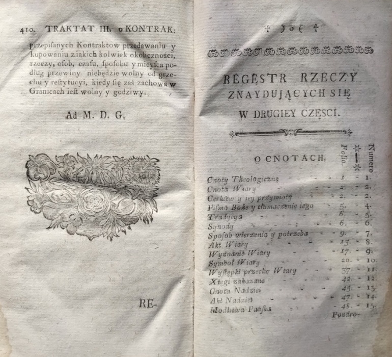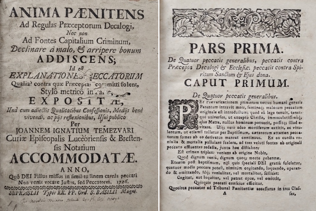Зберігається у відділі рідкісний видавничий конволют у складі двох перекладених польською мовою видань 1722 р.: твору історика І ст. Йосипа Флавія «Sława dawney Jerozolimy, przy zburzeniu swoim y całey zydowskiey ziemi spustoszeniu, w własnychże popiołach y ruinie od Rzymskiey potencyi zagrzebiona» (іл. 3) та опису подорожі до Святої Землі польського мандрівника та проповідника Ансельма Бернардина «Peregrynacya prawdziwego opisania Ziemi Swiętey, Betleem, y Jerozolimy» (іл. 4). Релігійну тематику продовжує твір із моральної теології секретаря луцького та берестейського єпископа Яна Ігнатія Темезварі «Anima pænitens ad regulas præceptorum decalogi» 1726 р. (іл. 6)