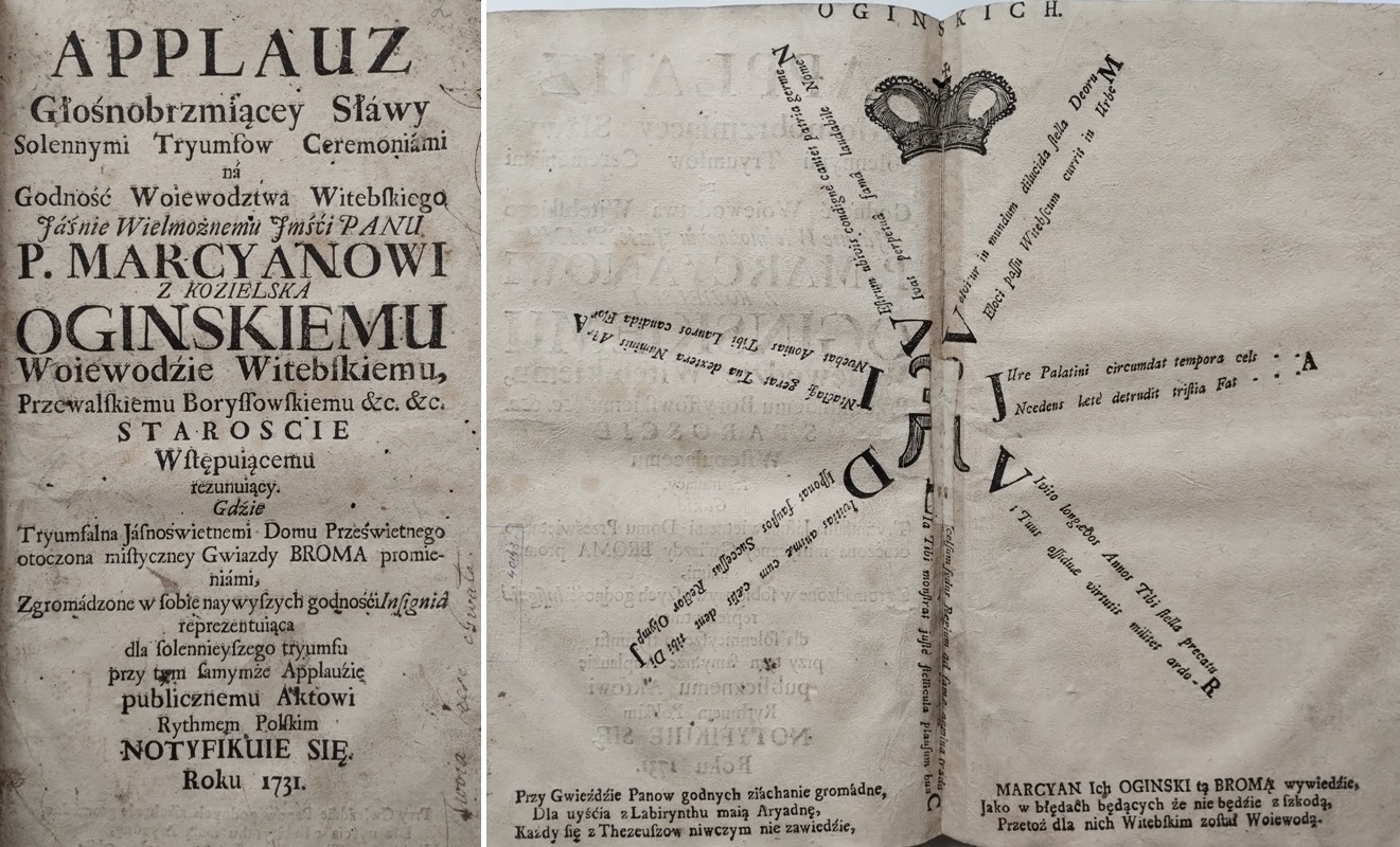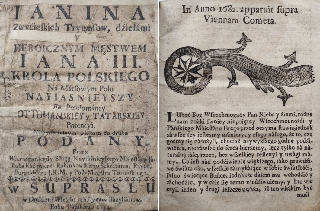 Історичній тематиці присвячено твір торунського райці, купця, бібліофіла, перекладача, письменника Якова Казимира Рубінковського про короля Яна ІІІ Собеського «Ianina zwycięskich tryumfow, dziełami y heroicznym męstwem Iana III. krola polskiego na Marsowym polu nayiasnieyszy ottomanskiey y tatarskiey potencyi» 1754 р. Видання містить дереворити, вірогідно, місцевого майстра (іл. 14–15). Гравюри скопійовано з мідеритів, вміщених у першому виданні цього твору, опублікованому в Познані в 1739 р.