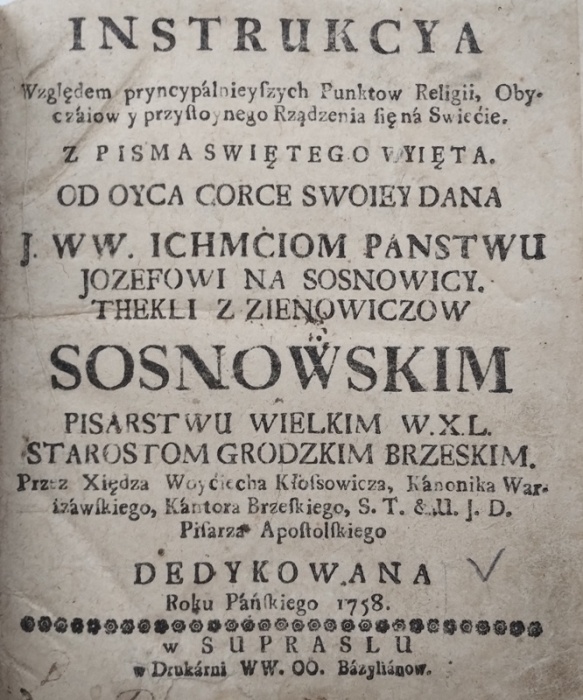 Увагу супрасльського осередку до вшанування регіональних святинь демонструє видання опису церемонії коронації Жировицької ікони Божої Матері, яка відбулась у 1730 р. Опис під назвою «Aquila grandis magnarum alarum in Zyroviciana solitudine nidificans, sub corona renascens beatissima Virgo Maria» склав Теофіл Єнткевич. Титул видання оформлено в нетиповий спосіб: він містить справа від назви два позначені зірочками посилання у формі друкованих маргіналій. Примірник відділу зберігся без титульного аркуша. Варто згадати також, що в 1722 р. вийшов друком «Лексикон», тобто церковнослов’янсько-польський словник (іл. 5).