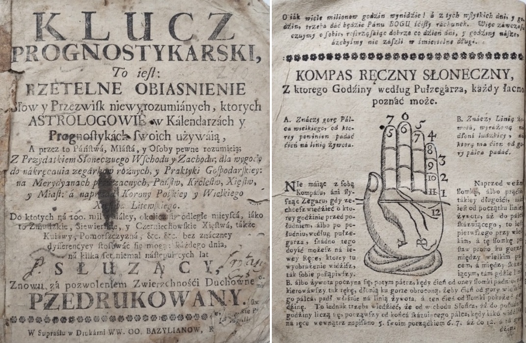 Цікаву сторінку представляють два видання 1740 та 1775 рр. під назвою «Klucz prognostykarski, to iest: rzetelne obiasnienie słow y przezwisk niewyrozumianych, ktorych astrologowie w kalendarzach y prognostykach swoich używaią» (Прогностичний ключ, тобто достовірне пояснення незрозумілих слів і назв, які астрологи використовують у своїх календарях і прогнозах) (іл. 18–21), які є свого роду додатком до традиційних для XVIII ст. календарів. Ці видання, серед іншого, містять медичні та господарчі поради, народні прикмети про погодні та господарські явища, відомості про вплив дня народження на риси характеру людини тощо. Окремі народні прикмети у цих виданнях викладено у віршованій формі.