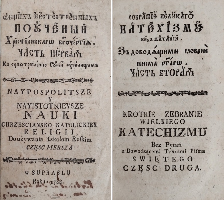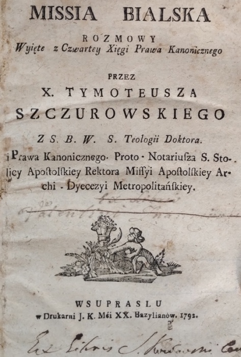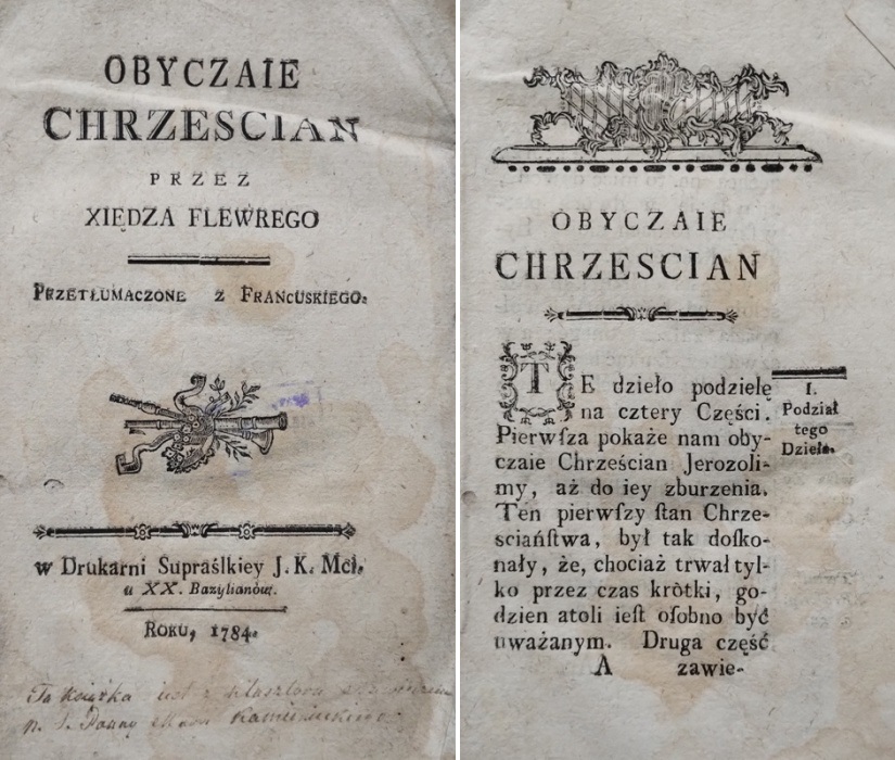 На виставці представлений примірник першого тому перекладеного польською мовою твору французького історика церкви Клода Флері «Obyczaie chrzescian», виданого в 1784 р. (іл. 26). Також є двотомні видання недільних проповідей Мартина Гайдзинського 1789 р. (іл. 28–30) та єзуїта, королівського проповідника Себастьяна Ляховського 1793 р. (іл. 31–33). Виклад канонічного права міститься у праці доктора теології та канонічного права, проповідника, отця василіанина Тимофія Щуровського під назвою «Missia bialska. Rozmowy wyięte z czwartey xięgi Prawa kanonicznego» 1792 р. (іл. 34–35).
