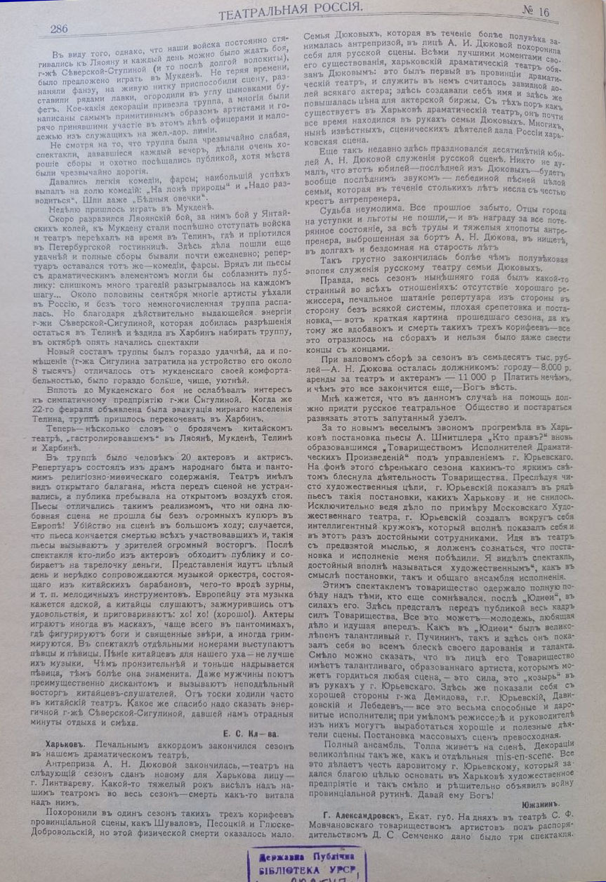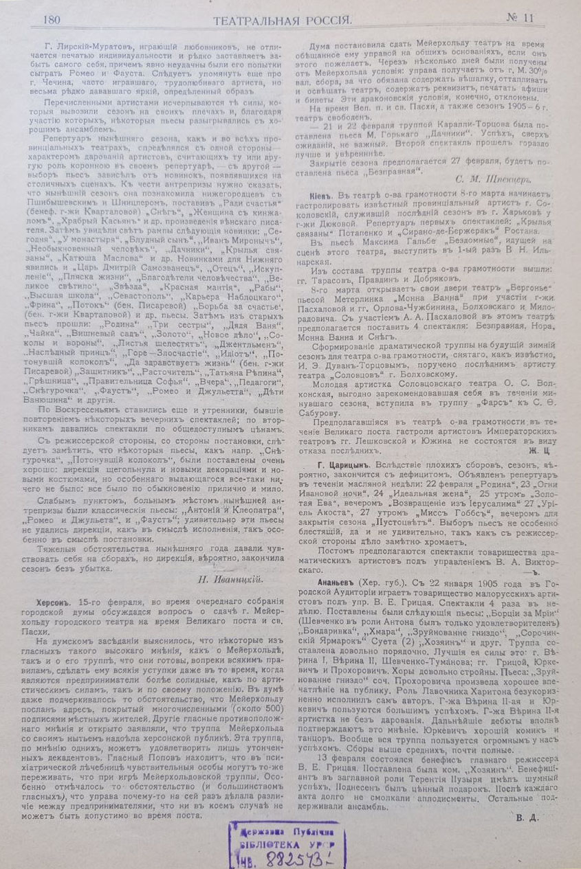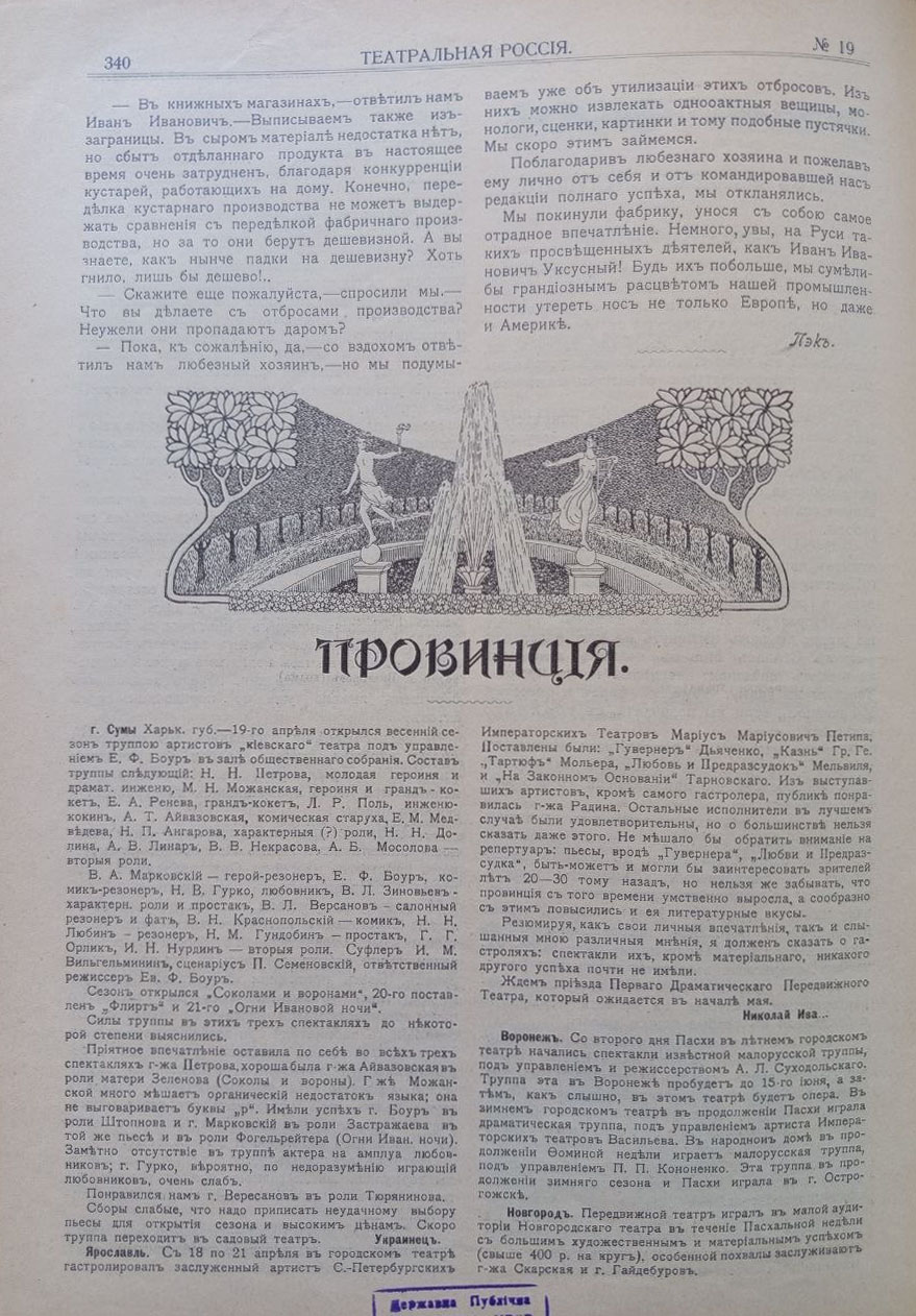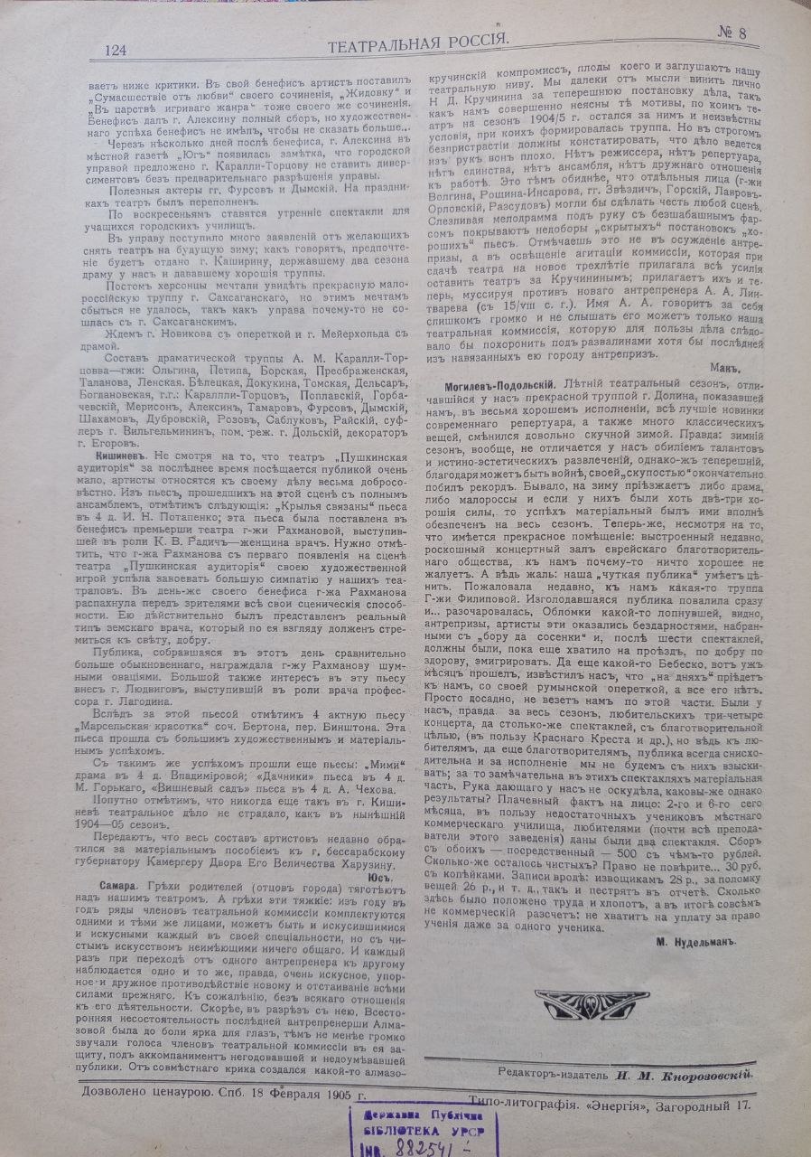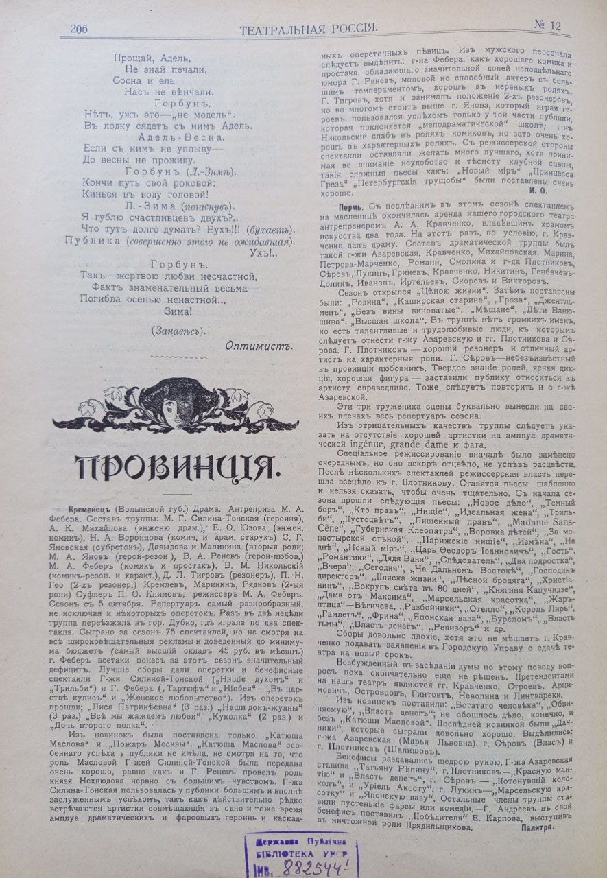 Театральний тижневик «Театральная Россия» виходив у 1904–1905 рр., у Санкт-Петербурзі під редакцією А. Кугеля, відображав широку картину життя всіх міст імперії. Видання мало інформаційно-критичний характер і виконувало функцію театральної хроніки, публікуючи рецензії, огляди сезонів та повідомлення про гастрольну діяльність. Значну увагу видання приділяло українським містам, де театральна культура на початку ХХ ст. Так, у Черкасах і Ромнах театральне життя мало епізодичний характер і залежало від мандрівних труп, а їх репертуар залежав від інтересів публіки. Така сама ситуація була і в Прилуках, де вистави відбувалися нерегулярно, здебільшого в тимчасових приміщеннях, але приїжджі колективи підтримували театральний інтерес містян. Близьким за характером був і театральний побут Кременця, де відсутність постійної трупи компенсувалася гастролями, що мали сезонний характер і залежали від загальних маршрутів мандрівних акторських колективів. Водночас Кам’янець-Подільський уже виступав як важливий регіональний осередок із більш усталеним театральним життям і регулярними виставами. Особливе місце займав Херсон, де з кінця ХІХ ст. функціонував стаціонарний театр і відбувалося насичене сценічне життя. Оголошення про вистави в повітових містах України регулярно публікувалися в журналі «Театральная Россія» разом з прізвищами задіяних акторів та деякою критикою вистав.