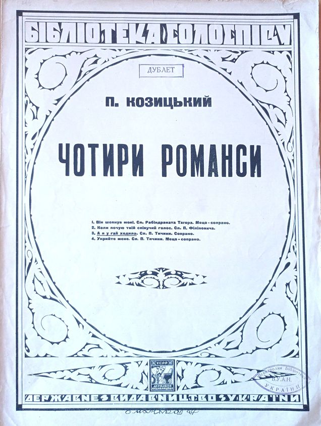 В електронній виставці представляємо графіку Олексія Маренкова, що міститься у нотних виданнях, яка водночас пов’язана з історією не тільки музичного, а й образотворчого мистецтва. Олексій Маренков активно застосовував у своїх роботах нарбутівські розробки та шрифти, про що згадує у своїй праці український мистецтвознавець Платон Білецький [3]. Художники-авангардисти в орнаментах відчували незвичайну експресивну силу, таку само абстрактну, як і музика, що здатна створити певний настрій або висловити його [1]. Чітка закономірність візерунків нагадує нам про симетрію і ритм в природі, і водночас вона вибудовується за законами мистецтва, ґрунтується на умовності. Такий орнамент нерідко тяжіє до декоративного стилю і стилізації. Прикладом може бути оформлення О. Маренковим романсів Якова Степового (Іл. 3, 4, 5), Юлія Мейтуса ( Іл. 6) та Гната Хоткевича ( Іл. 7).